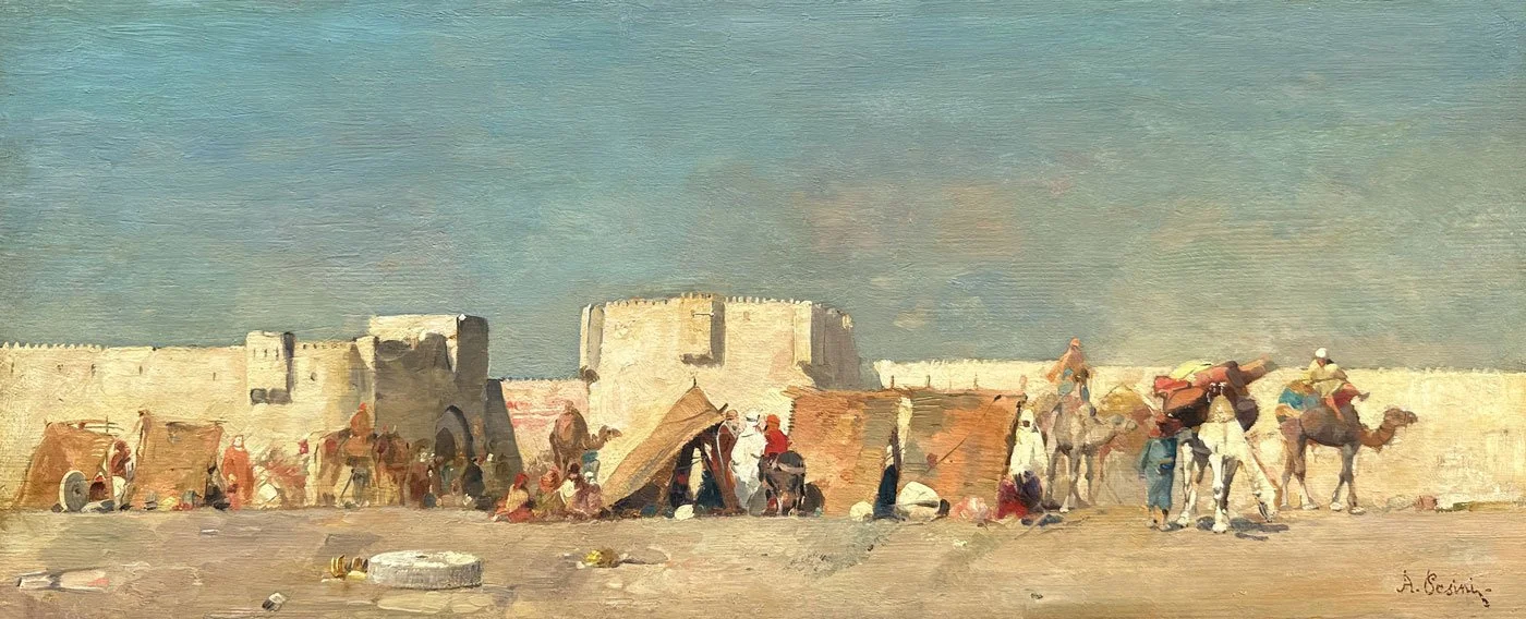 This important early Orientalist work by Alberto Pasini was exhibited at the Paris Salon in 1859. It depicts pilgrims on their way to Mecca camped outside the city gate of the port of Jeddah.