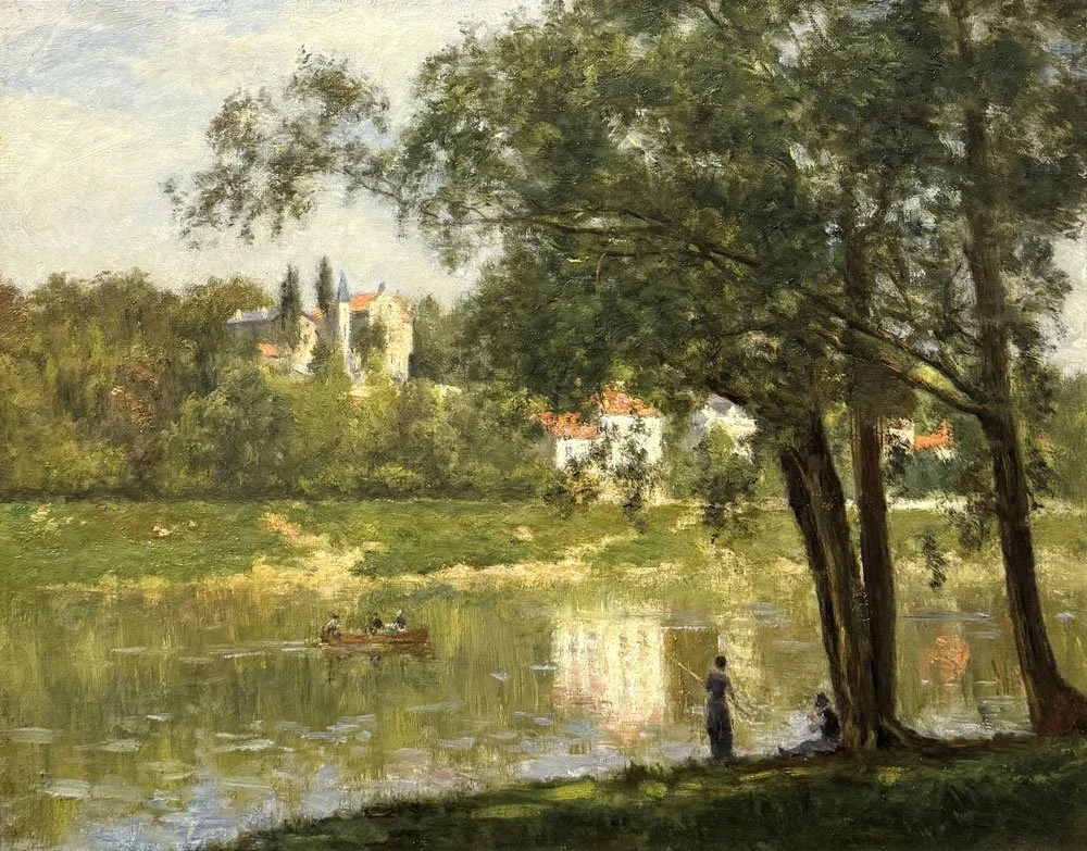 Painted circa 1877-1882, this is one of several depictions of the Seine at Courbevoie which Lépine painted during the same period in which Alfred Sisley, Claude Monet and other Impressionist painters were also producing views of this location. A slightly larger view of L’Île de la Grande Jatte by Lépine, similarly depicting a woman fishing by the same group of trees, is included in Robert and Manuel Schmidt’s Lépine catalogue raisonné (no. 406). A small preparatory oil study for the present painting, titled Bords de Seine en aval de Paris - Le Bachot (signed S. Lépine, oil on panel, 6 x 9 inches), was sold at L’Huillier & Associés, Paris on October 18, 2022 (no. 523 in the Lépine catalogue raisonné).