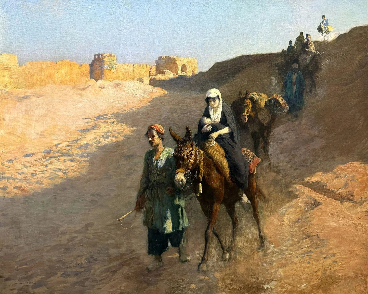 Painted circa 1892. The subject of this work is described in the catalogue of the artist's estate sale: "Here we have a Persian family on a journey from one place to another. The father walks along, holding the mule by the bridle, while the mother is mounted on a native saddle and bears in her arms the child. Behind follows a mule laden with their baggage. Other travellers follow. The walls of an old town loom up in the background." Weeks painted the same Persian family in his Persian Mother and Child (oil on board, 12 x 19 inches), a work painted en grisaille for publication as a print and illustration for his 1893 article for Harper's Magazine.